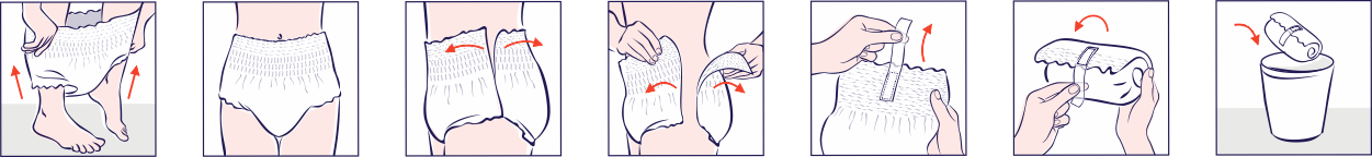 Mitruma indikators sniedz informāciju, kad ir nepieciešams nomainīt izlietoto produktu, savukārt atzīme “FRONT” palīdz atšķirt mugurpusi no priekšpuses. Izlietotā produkta utilizācija ir diskrēta un higiēniska pateicoties speciālai līmlentei uzsūcošās apakšveļas aizmugurē.